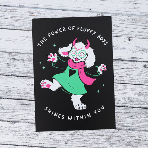 My new Fluffy Boys t-shirts are now available! They feature Ralsei, inspired by Deltarune with the quote from the game, "the power of fluffy boys shines within you". The design is screen-printed in white, pink and green on to black Gildan softstyle t-shirts.