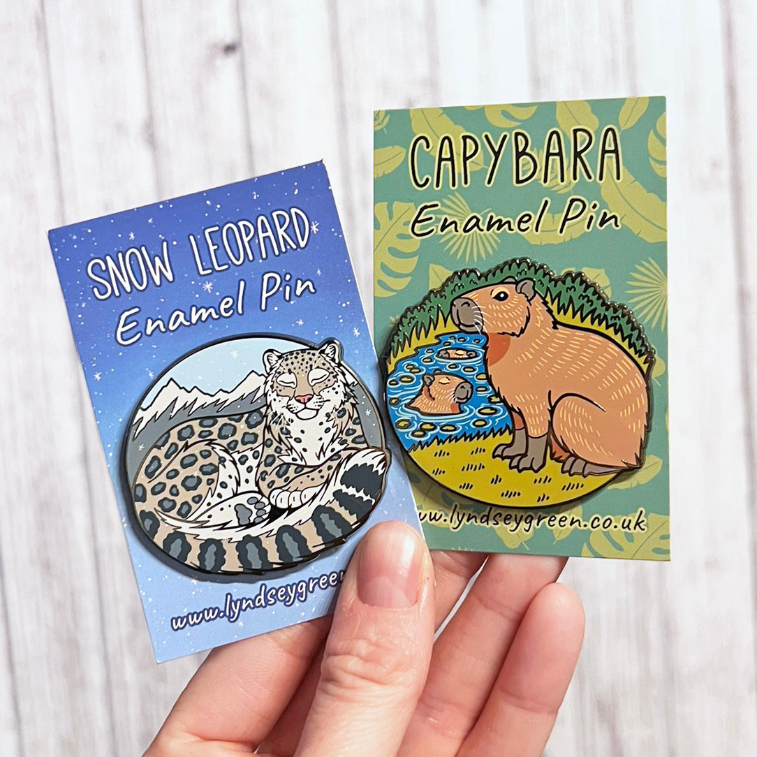 There are two new enamel pins now available from my shop - snow leopard an capybaras! Both are 50mm wide, and have screen printed details.