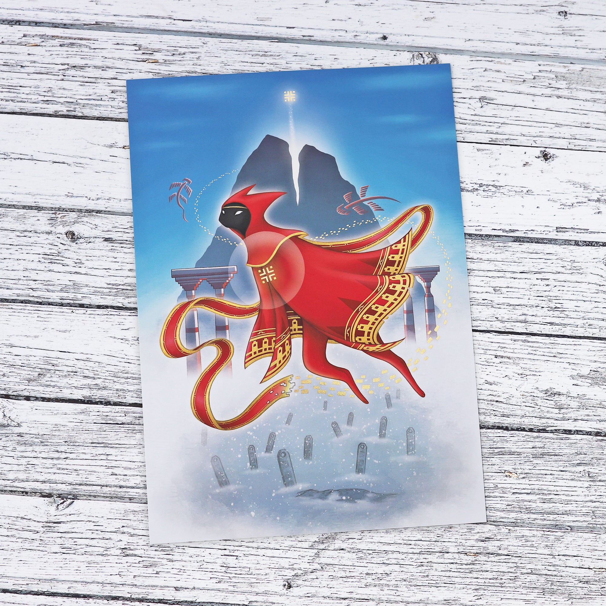 This is an A4 (29.7 x 21 cm) print of my Journey illustration, inspired by the video game. It has gold foil details in the patterns, and the whole page shimmers with an iridescent finish.