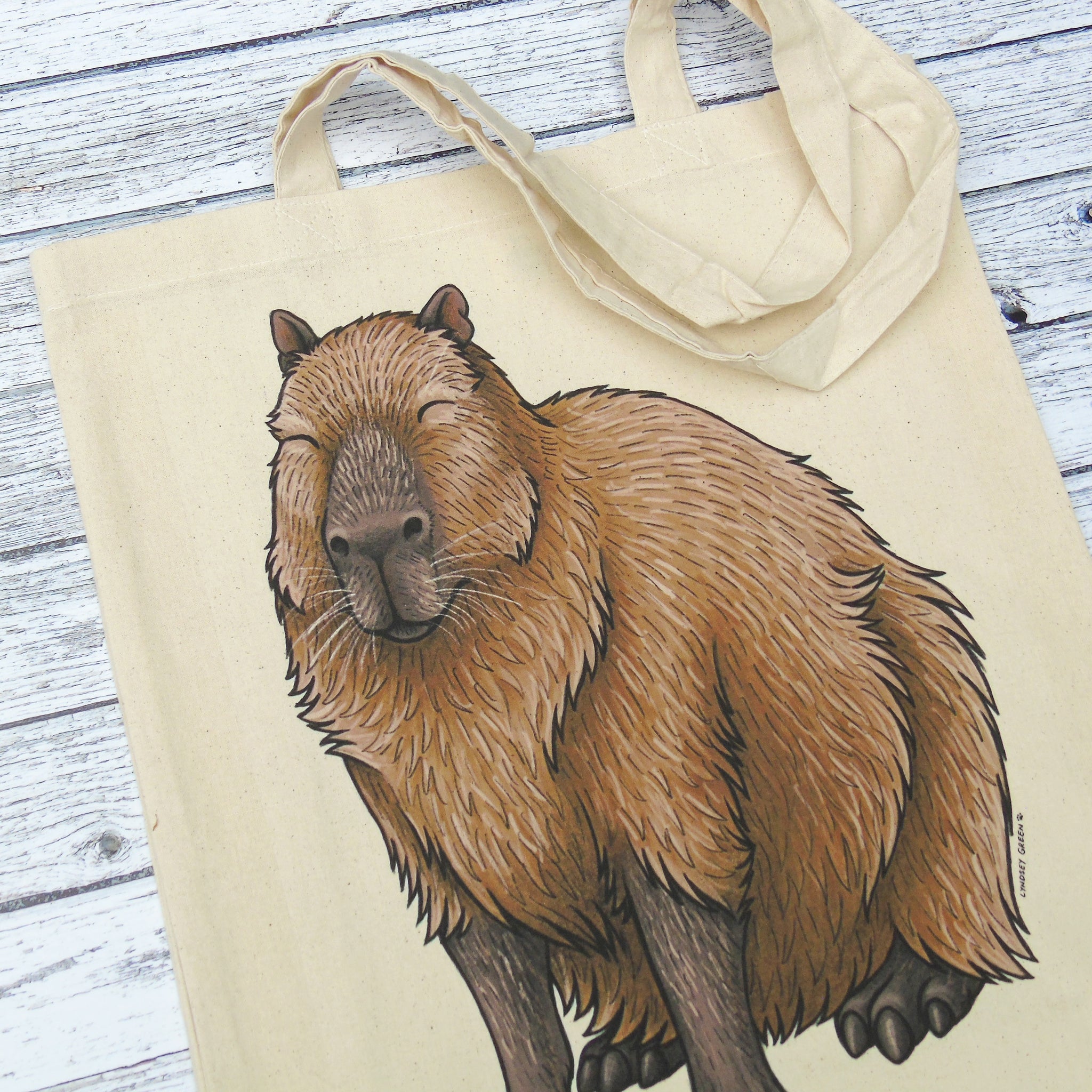 These cotton tote bags feature my capybara illustration on the front of the bag. They also have gusseted side allowing more space for carrying bulkier items.